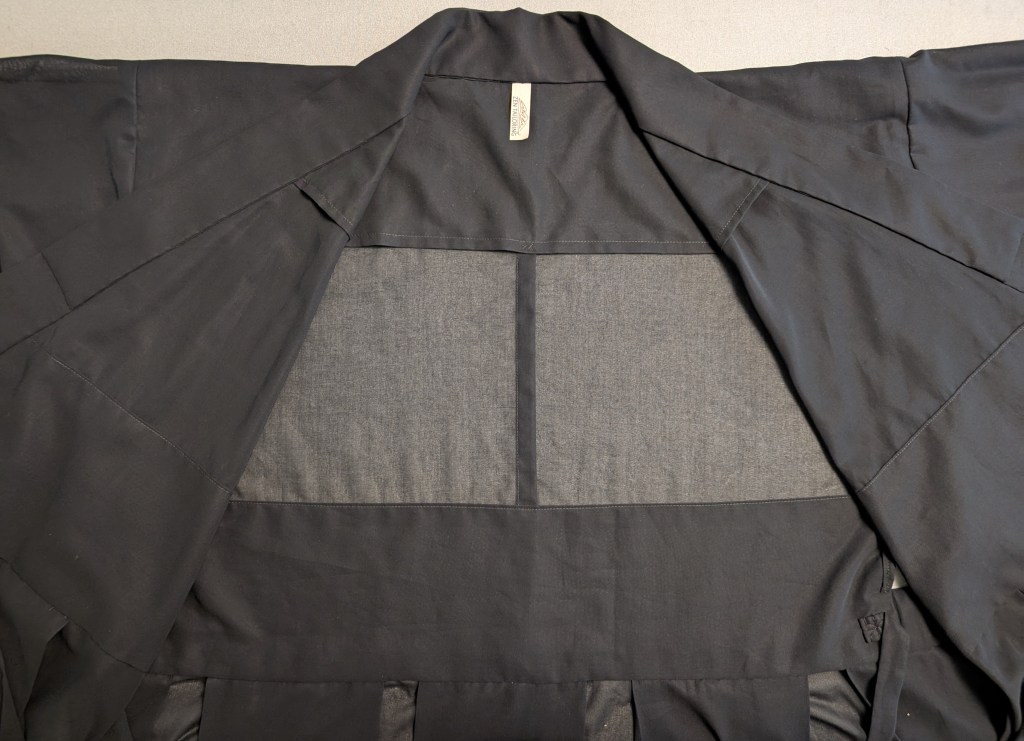 | Georgette | 100% polyester | Black | Lightweight and semi-sheer with a subtle crepe texture and liquid drape. Wrinkle resistant. Popular fabric for koromo made in Japan. | — |