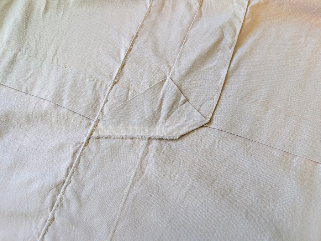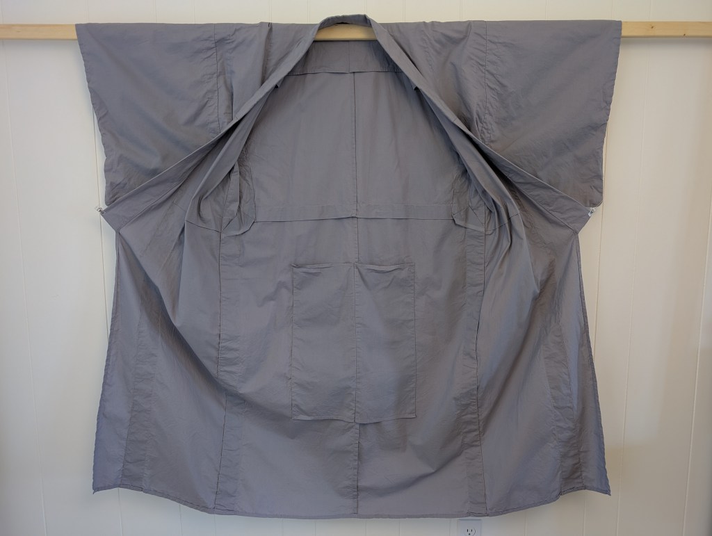 One of the defining features of a high-quality Japanese kimono is the way that the inner seam allowances are folded over and sewn with invisible stitching to hide the seams and fabric edges on the inside. This creates a striking inner finish that is both functional and beautiful. In order to keep the cost down, I offer the basic version of this kimono without this inner seam treatment — the seam allowances are simply pressed open, as is standard for most machine-finished garments. For those who want the fully traditional finish, however, I offer the option to add this inner seam treatment for additional fee. Due to the nature of the seams, this option cannot be combined with side pleats.